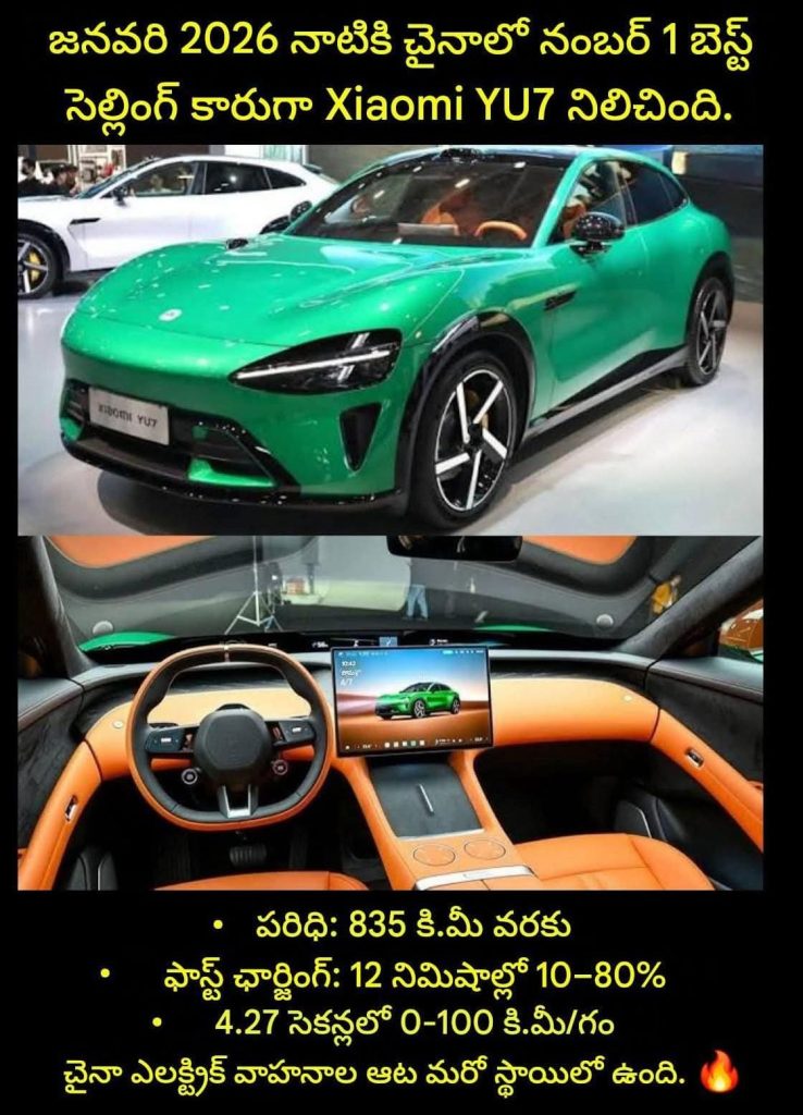ప్రపంచ ఆటోమోటివ్ ల్యాండ్స్కేప్లో ఒక పెద్ద మార్పుగా, Xiaomi YU7 SUV అధికారికంగా జనవరి 2026లో చైనాలో అత్యధికంగా అమ్ముడైన #1 వాహనంగా నిలిచింది, 37,869 యూనిట్లను అందించింది మరియు దాని ప్రాథమిక ప్రత్యర్థి టెస్లా మోడల్ Y అమ్మకాలను సమర్థవంతంగా రెట్టింపు చేసింది. టెక్ దిగ్గజం యొక్క రెండవ ఎలక్ట్రిక్ మోడల్గా 2025 మధ్యలో ప్రారంభించబడిన YU7, టెస్లా కంటే దాదాపు 10,000 యువాన్లు తక్కువ ధరతో – 835 కి.మీ పరిధిని మరియు దాని మ్యాక్స్ వేరియంట్లో 3.23 సెకన్లలో 0–100 కి.మీ/గం వేగాన్ని అందించడంతో సహా – ఫ్లాగ్షిప్ పనితీరును అందించడం ద్వారా మార్కెట్ను ఆధిపత్యం చేసింది. అధునాతన 800V ఆర్కిటెక్చర్పై నిర్మించబడిన ఈ SUV కేవలం 15 నిమిషాల్లో 620 కి.మీ పరిధిని జోడించగలదు, అయితే దాని AI-ఇంటిగ్రేటెడ్ క్యాబిన్, HyperOS ద్వారా ఆధారితం, Xiaomi స్మార్ట్ఫోన్ వినియోగదారులకు అతుకులు లేని పర్యావరణ వ్యవస్థను అందిస్తుంది. ఈ అమ్మకాల విజయం Xiaomiకి “ముఖ్యమైన స్థానం”గా నిలుస్తుంది, ఇది రికార్డు సమయంలో 600,000 సంచిత డెలివరీలను చేరుకుంది, “ఫోన్ల నుండి వేగవంతమైన కార్లకు” దాని పరివర్తన ఇప్పుడు ధృవీకరించబడిన మార్కెట్-ప్రముఖ విజయం అని రుజువు చేస్తుంది.